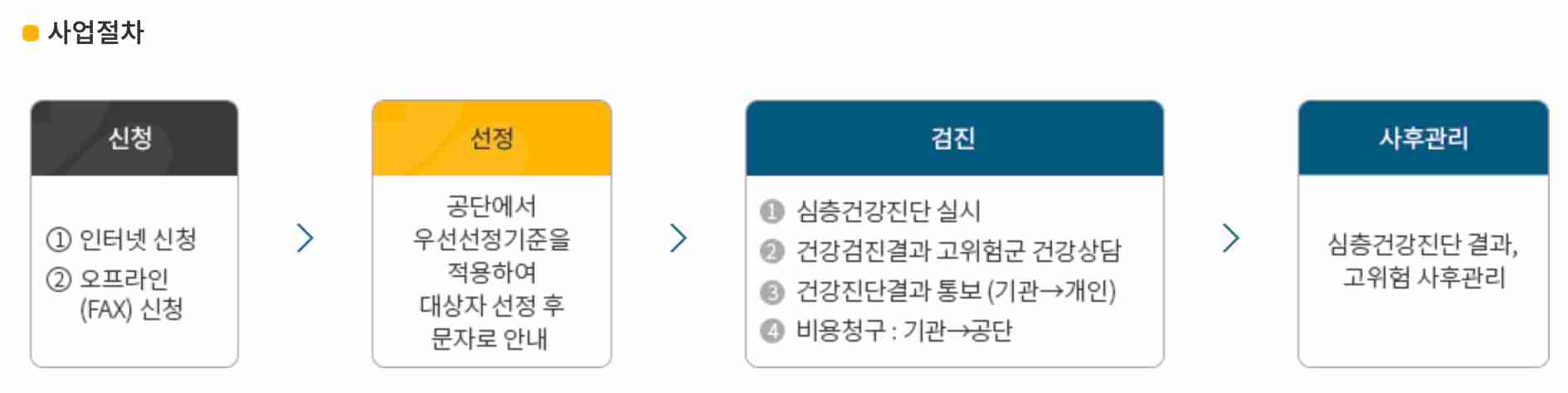 신청은 온라인 신청 또는 방문 신청으로 할 수 있고 선정되면 문자로 안내를 해줍니다. 뇌심혈관 심층건강진단 대상자 선정 후 심층건강진단을 실시하고 건강검진결과 고위험군에 속하면 건강상담을 받으며 사후관리를 받을 수 있습니다.